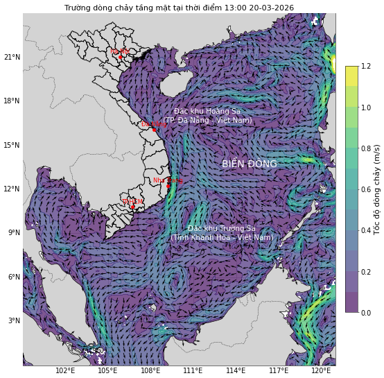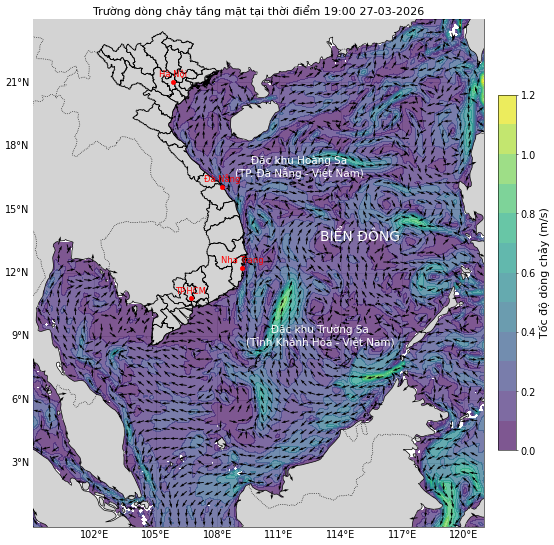 Dự báo vận tốc và hướng dòng chảy tầng mặt cho toàn bộ khu vực Biển Đông và ven bờ Việt Nam với thời hạn 10 ngày