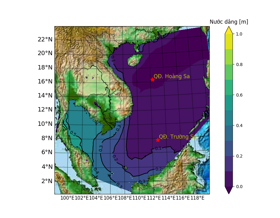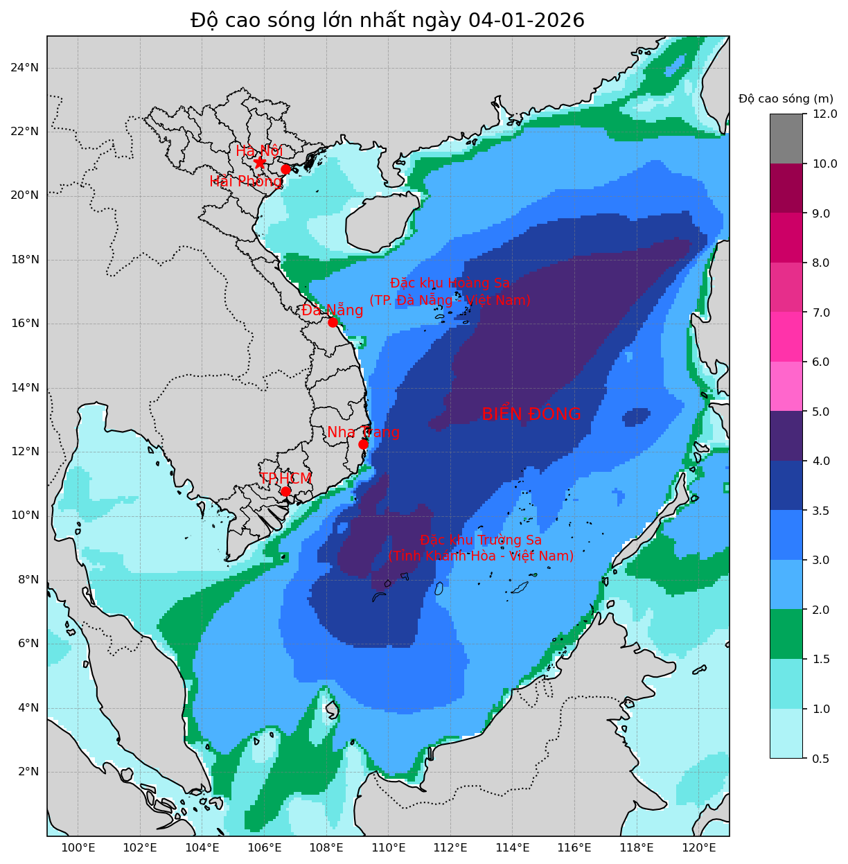 Gió đông bắc cấp 5, có lúc cấp 6, giật cấp 7-8, từ gần sáng mai gió mạnh dần lên cấp 6, giật cấp 7-8. Riêng vùng biển Khánh Hòa cấp 6, từ ngày mai có lúc cấp 7, giật cấp 8-9, biển động mạnh. Sóng cao