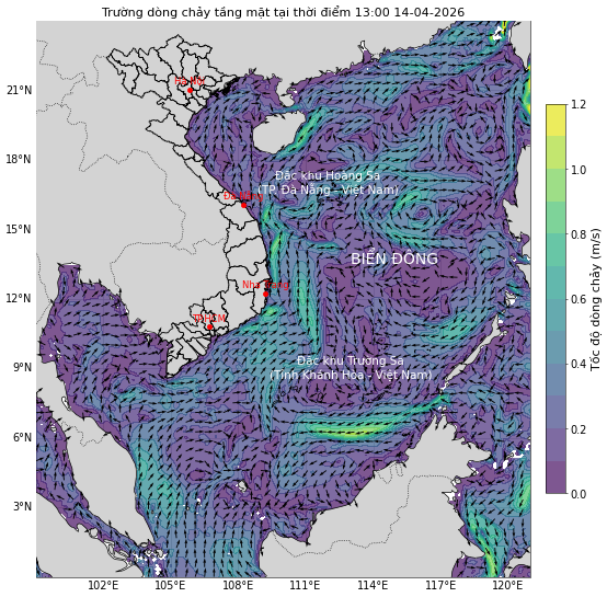Dự báo vận tốc và hướng dòng chảy tầng mặt cho toàn bộ khu vực Biển Đông và ven bờ Việt Nam với thời hạn 10 ngày