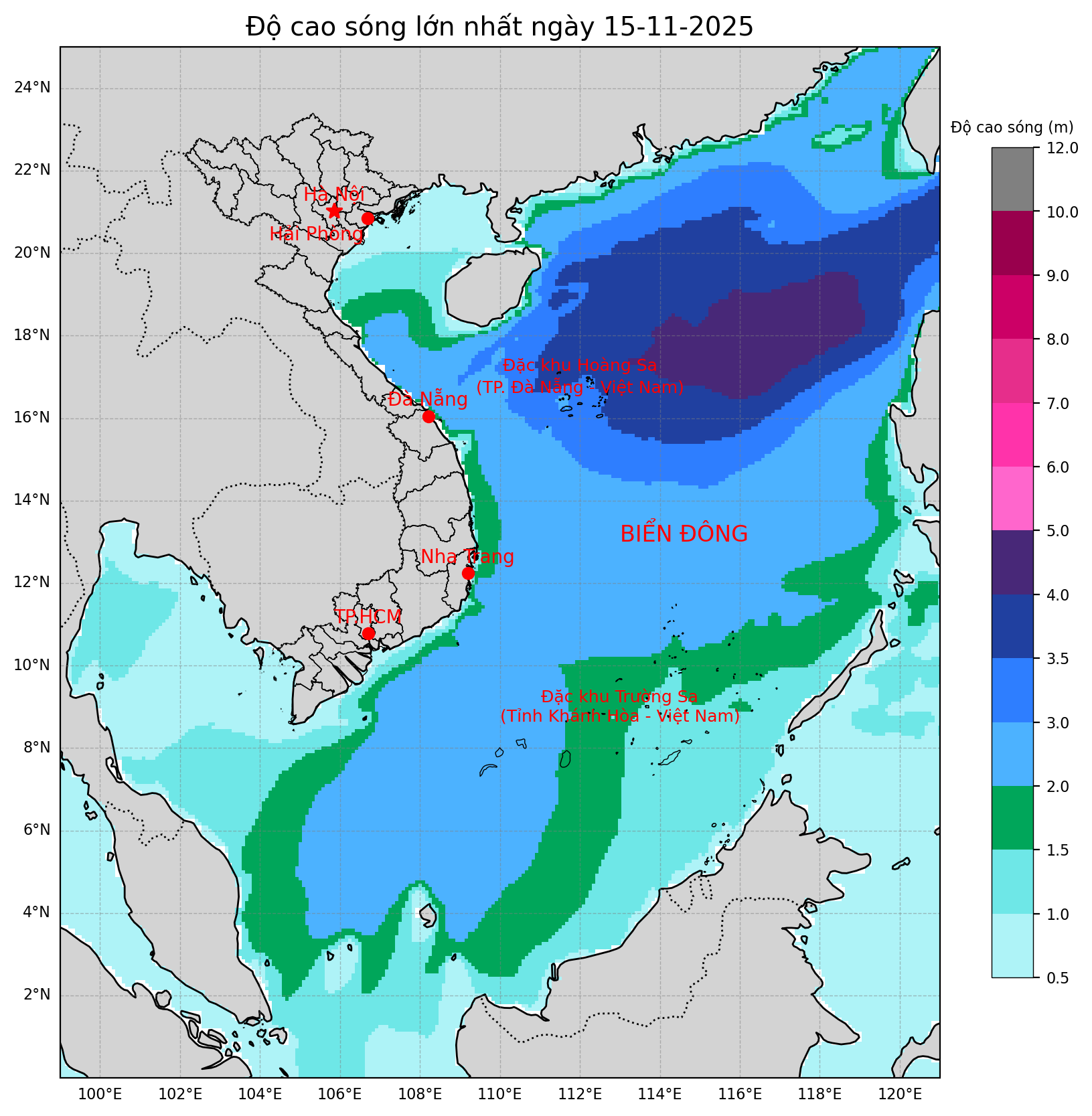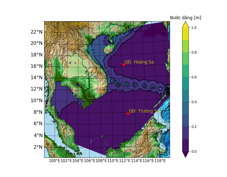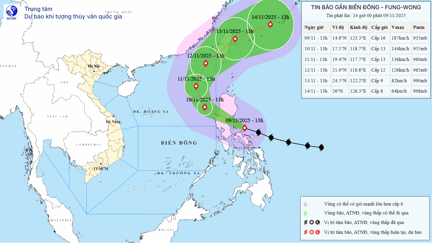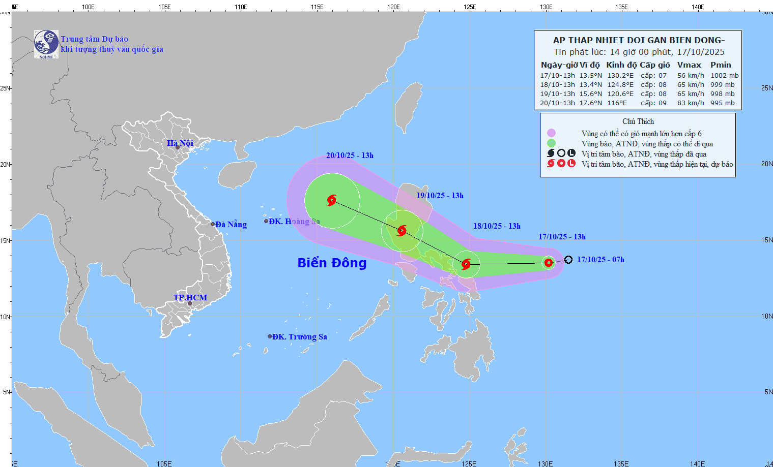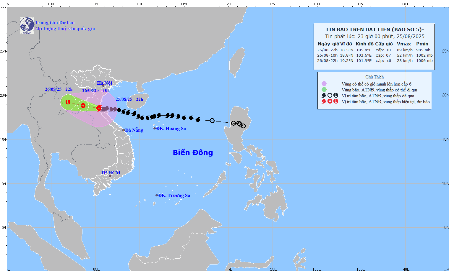 Gió đông bắc đến bắc cấp 5, có lúc cấp 6 giật cấp 7-8; riêng phía Đông gió mạnh cấp 6-7, sau tăng lên cấp 8-10, vùng gần tâm bão cấp 11-13, giật cấp 16, biển động dữ dội. 7,0 - 9,0m, vùng gần